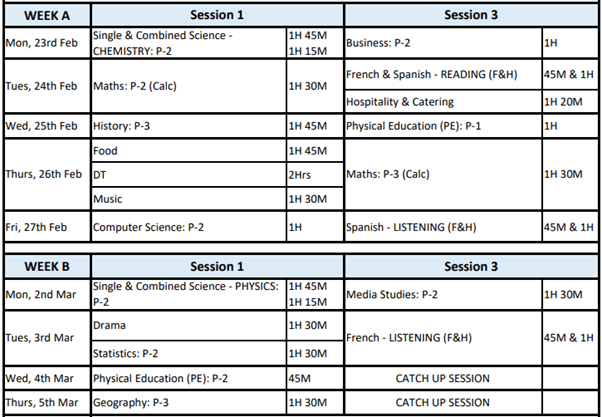- Exam timetable – shared with students in December. Please do consider this when planning holidays and other out of school activities.